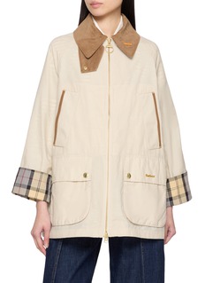 Barbour's oversized jacket blends heritage styling with contemporary proportions through contrasting collar and cuff detailing. Signature features include exposed zip-front closure, bellows pockets, and embroidered branding accents. The relaxed A-line silhouette and thoughtful mixed-texture design elevate this modern classic.