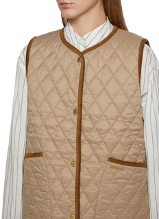 This classic Barbour quilted vest in a soothing beige finish is the epitome of versatility and style. Designed to provide additional warmth without bulk, it features a refined diamond quilting pattern, gold-toned snap buttons, and a neatly tailored silhouette that layers effortlessly over any ensemble.