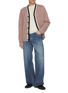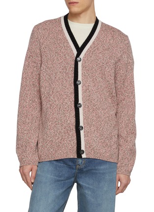 A study in quiet contrast, this cardigan by Barrie elevates classic Arran knitting with a softly mottled cashmere base and a graphic two-tone button placket. Finished with hand-painted porcelain buttons, it layers effortlessly over tees or shirts for refined everyday dressing.