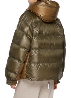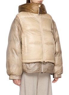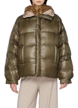 Beautiful People reimagines cold-weather ease with this cloud-light down blouson, shaped to a softly inflated profile that wraps the body in warmth. The reversible palette moves from earthy depth to luminous neutrals, offering a change in mood with a single gesture. A versatile layering piece that brings quiet drama to winter dressing, whether paired with knits or fluid trousers.