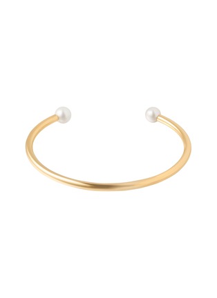 Bijou de M distills modern romance into a bangle, crafted from 18K gold-plated sterling silver and tipped with twin freshwater pearls. Understated yet luminous, it slips on for everyday polish and after-dark ease. Wear solo for purity or stack with fine chains.
