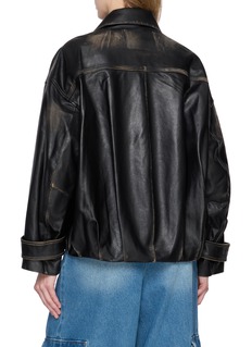 With its artfully distressed finish and voluminous silhouette, this BOINIGAN leather jacket redefines the edge of classic outerwear. The asymmetric zip closure and statement collar channel a rebellious spirit, balanced by subtle tailoring and fluid drape for contemporary ease.
