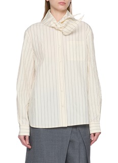 This BOINIGAN shirt reinterprets the classic stripe with a sculptural twist. Defined by a wide lapel collar that folds into an asymmetric neckline, the piece balances sharp tailoring with fluid drape for a quietly avant-garde statement. The lightweight, crinkled texture lends depth and a relaxed sophistication.