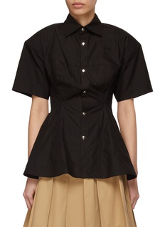 BONBOM presents this shirt, artfully crafted from pure cotton and rendered in an all-black colourway. Refined by its nipped in waist and trumpet sleeves, this piece boasts a backless design to exude a feminine allure.