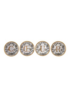 Boncoeurs's coasters arrive as a set of four, each adorned with exquisite floral illumination and gilded letters. These coasters are crafted from enamelled aluminium, offering a unique shine and luxurious feel. The hand-gilded edges add an extra touch of elegance, making them perfect for both decorating and protecting your table.