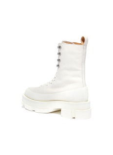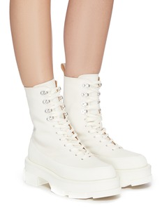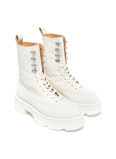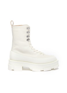 Paris-based label both combines natural rubber materials with cutting-edge technologies to present these Gao combat boots. Crafted from a tasteful combination of leather and rubber, screened in a monochromatic hue and detailed with a laced-up guard and a chunky outsole, this pair will lend your ensembles an alluring neoteric aesthetic.