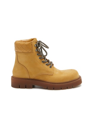 Elevate your look with Bottega Veneta's lace-up ankle boots in nubuck calfskin. Meticulous Intrecciato craftsmanship meets rugged details like hiking-inspired hooks, all wrapped in a refined moc-toe construction. A flawless blend of craftsmanship and contemporary design for elevated style.