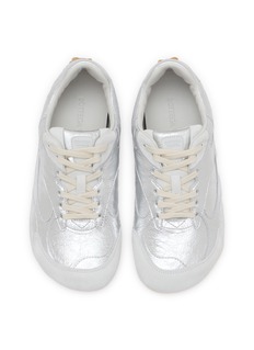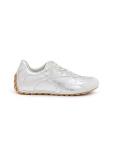 Elevate your casual footwear collection with these Bottega Veneta sneakers, meticulously crafted from luxurious metallic silver leather. The design features the brand's subtle yet distinctive intrecciato pattern, offering a textural allure that enhances the shoe's sleek silhouette. Set on a durable rubber sole for optimal comfort and traction, these sneakers are perfect for those who seek a blend of contemporary style and classic craftsmanship.