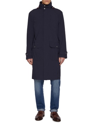 Designed with a refined technical sensibility, this performance coat reflects Brunello Cucinelli’s balance of elegance and function. The fluid nylon-elastane shell offers comfort and protection, ideal for urban commutes or travel when layered over knitwear and denim.
