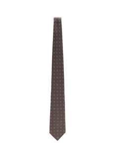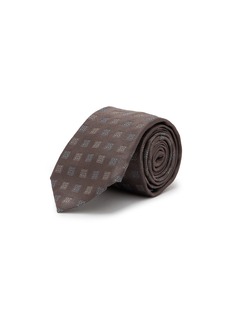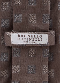 Elevate your formal attire with this exquisite Brunello Cucinelli silk tie, presented in a refined mocha shade. The tie features an intricate pattern of geometric motifs, adding a touch of subtle luxury and texture. Crafted from premium silk, this accessory promises a smooth, lustrous finish that complements any high-end wardrobe. Perfect for business meetings or special occasions, it pairs beautifully with tailored suits for a polished look.