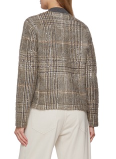 An ode to heritage reimagined, this cardigan blends mohair, virgin wool, and cashmere with delicate sequins that shimmer across a Prince of Wales-inspired check. The contrasting trim and gold-toned buttons infuse modern elegance, creating a straight silhouette that transitions effortlessly from day to evening.