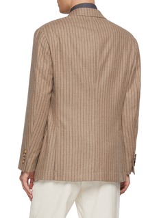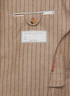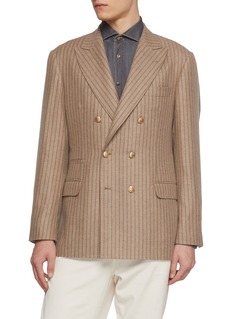 Woven from an exquisite blend of cashmere and silk, this Brunello Cucinelli blazer epitomises quiet luxury. The subtle stripe pattern lends depth and refinement, complemented by sculptural shoulders and embossed brass buttons. Its double-breasted cut and soft tailoring create a timeless statement of modern Italian elegance.