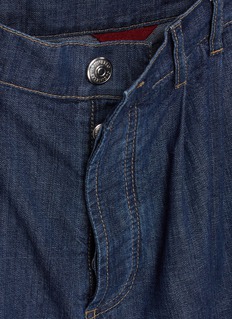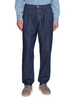 Defined by Brunello Cucinelli’s understated tailoring codes, these denim pants reinterpret classic workwear through a sartorial lens. The double-pleat construction softens the silhouette, while the mid-weight cotton denim delivers structure with lived-in ease—suited to polished daywear or relaxed smart-casual looks.