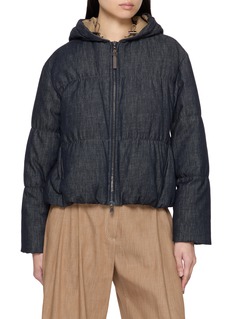 Urban sophistication meets cosy warmth in this puffer jacket, where matte denim-like fabric and a sleek, cropped silhouette create a modern twist on classic outerwear. The hooded design and minimalist detailing offer both style and function, making it a versatile layer for the contemporary wardrobe.