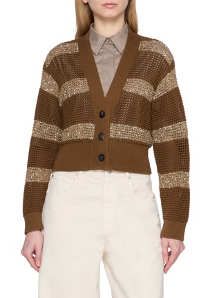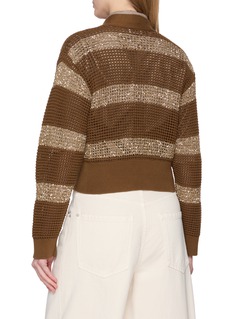 Imbue some sparkle into your wardrobe with this Brunello Cucinelli cardigan, where metallic sequins are woven through an open-knit pattern, creating a luminous shimmer. The relaxed silhouette and soft, textured yarn blend comfort with understated glamour.