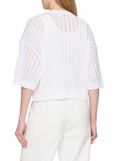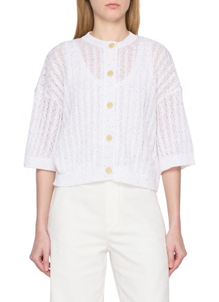 Light and delicately textured, this cropped cardigan plays on transparency and shine. An airy open-knit construction is subtly illuminated with scattered micro-sequins, while tonal buttons trace the single-breasted front. The silhouette falls boxy and slightly relaxed, making it ideal for layering over a tonal camisole or styling solo for understated evening polish.
