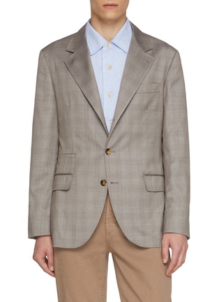Embrace timeless sophistication with this Brunello Cucinelli blazer, meticulously tailored from a luxurious blend of wool and silk. This blazer features a subtle check pattern in a neutral palette, making it a versatile choice for any wardrobe. The structured fit, sharp notched lapels, and classic two-button closure reflect traditional Italian craftsmanship.