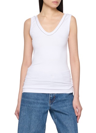 BRUNELLO CUCINELLI - Sleeveless Shiny Trim Cotton Ribbed Jersey Top