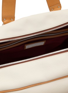 Brunello Cucinelli's weekender bag embodies Italian elegance through its structured silhouette and refined two-tone craftsmanship. The design features contrasting leather trim, dual top handles with detachable shoulder strap, front envelope pocket, and protective corner guards. Timeless sophistication and functional versatility for refined travel.