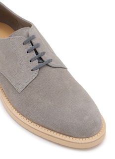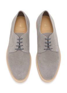 Embody refined elegance with these Brunello Cucinelli Derby shoes, expertly crafted from sumptuous suede in a soft grey hue. The design features a clean, minimalist silhouette with subtle stitching details and a contrasting light beige rubber sole that adds a modern twist while ensuring durability and comfort. Perfect for adding a touch of sophistication to both business and casual attire, these shoes are a testament to timeless style and Italian craftsmanship.