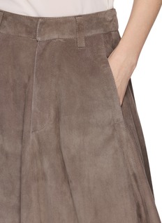 Crafted from supple suede, this Brunello Cucinelli skirt embodies understated sophistication. The mid-length silhouette flares gently with movement, while the soft, velvety texture enhances its timeless femininity. Pair it with knee-high boots or a chunky knit for an effortlessly polished autumn look.