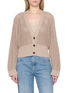 Airy and textural, this Brunello Cucinelli cardigan is crafted in lightweight cotton with an intricate openwork knit. Subtle scattered sequins catch the light against its relaxed silhouette, while the cropped proportion and ribbed hem lend modern balance—style over tonal layers for effortless summer refinement.