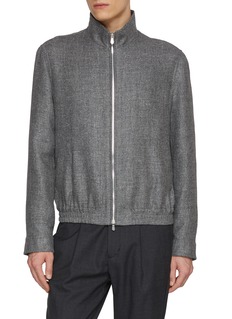Elevate your wardrobe with the Brunello Cucinelli Zip-Up Jacket, a synthesis of luxurious materials and meticulous Italian craftsmanship. This piece is designed from an exquisite blend of wool and cashmere, providing a soft, yet durable texture that's perfect for the season. The jacket's sophisticated grey hue is complemented by a subtle weave that adds depth and interest. Featuring a classic stand collar and streamlined zip front, it offers both versatility and style.