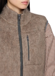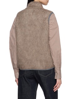 This Brunello Cucinelli vest reinterprets utilitarian style through the house’s lens of refined craftsmanship. Spun from a luxurious blend of virgin wool, mohair, and cashmere, its brushed surface reveals a rich, tactile softness. Detailed with contrast zips and functional pockets, it offers warmth and texture—ideal for layering over crisp shirting or knitwear.