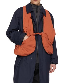 Following origami-inspired principles, the PO's structure reveals a series of intricate layers replicated in either bag or gilet form. The exterior features two hidden pockets and D-ring clips for attaching small items.