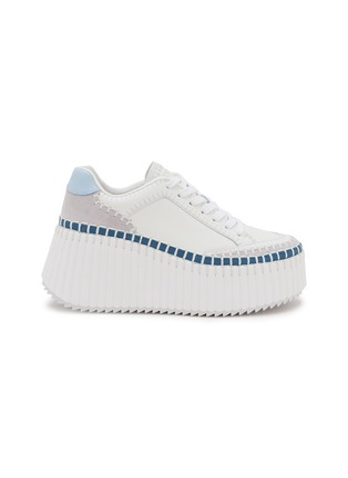 Elevate your footwear collection with these striking Chloé sneakers, meticulously crafted to blend function with high fashion. The bold, chunky design is highlighted by a striking white and blue rubber sole that not only offers enhanced durability but also adds an unexpected pop of color. The upper combines smooth white leather with soft gray suede, punctuated by delicate stitch detailing for a touch of artisanal craftsmanship