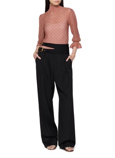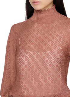 A study in quiet radiance, this Chloé sweater pairs airy transparency with soft metallic shimmer. The ruffled high neck and puffed elbow-length sleeves lend vintage romance, while delicate buttons trace the back for a refined finish—ideal layered over silk camisoles for day-to-dusk elegance.