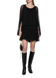 Soft, weightless layers define this cape mini dress, crafted in Chloé’s signature organic silk mousseline and gathered into a romantic, free-flowing silhouette. Ruffled tiers and delicate drawstring ties with gold-tone tips create subtle movement, making it an effortless choice for evening moments or elevated daytime styling.