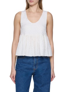 Chloé channels a soft, poetic ease through this scoop-neck jacquard top, where tonal raised dots lend subtle texture against a breezy, flared peplum hem. Its airy silhouette feels effortless for summer layering, pairing beautifully with wide-leg denim or tailored shorts for sun-lit days.