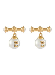 Chloé Classy dangling earrings in gold brass, featuring a resin pearl-embellished T-bar and a resin pearl pendant detailed with a cursive C. Adorned with a Chloé logo engraving to sign these earrings, the pair strikes the perfect balance between style and class.