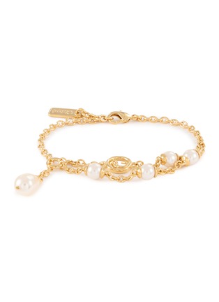 Chloé Classy bracelet in gold brass with a double chain at the front, featuring a cursive C medal and multiple glass pearl inserts. Adorned with a gold-toned Chloé logo plate to sign this piece, this piece strikes the perfect balance between style and class.