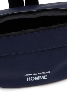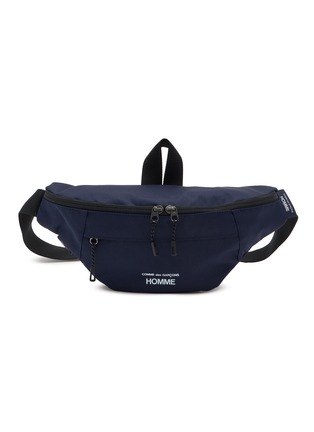 Comme des Garçons Homme presents a streamlined waist bag with minimalist logo branding and dual-zip main compartment for secure storage. The ergonomic crossbody silhouette with adjustable webbing strap and front zip pocket delivers hands-free convenience, while clean-lined construction and functional hardware create a versatile essential for active urban lifestyles.