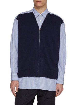 A study in proportion and contrast, this cotton shirt from COMME des GARÇONS HOMME reimagines classic tailoring through layered construction. The striped base is overlaid with a zip-front V-neck knit panel, offering depth and quiet subversion—ideal for modern office edits or elevated weekend styling.