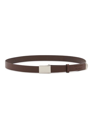 Comme des Garçons Homme crafts a refined minimalist belt with sleek rectangular plaque buckle and embossed branding at the keeper loop. The streamlined silhouette with polished hardware and clean construction delivers understated Japanese sophistication, while the versatile design and signature detailing create an essential wardrobe staple for discerning modern dressing.