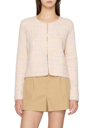 This tweed jacket captures timeless elegance with its refined silhouette. The delicate pink hues features an artisanal weave, whilst the cropped length creates a contemporary proportion.