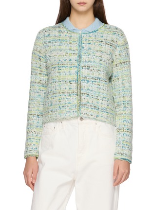 This tweed jacket captures timeless elegance with its refined silhouette. The delicate green hues features an artisanal weave, whilst the cropped length creates a contemporary proportion.