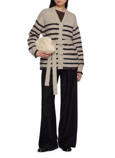 Woven from bouclé wool yarns infused with metallic threads, this V-neck cardigan by CRUSH Collection reveals a tactile striped jacquard that glimmers softly under the light. The matching belt shapes the silhouette with effortless nonchalance, while hand-crocheted trims ground the look in artisanal charm—perfect layered over fluid trousers for a quietly luxurious winter mood.