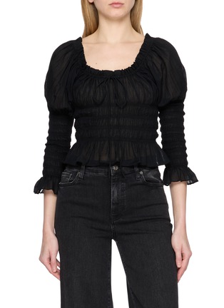 A study in modern Victoriana, the Baptisia top by DÔEN is crafted from organic cotton voile for an airy, weightless drape. Puffed Juliet sleeves and a scoop neckline with a delicate centre tie evoke heirloom romance, while the smocked bodice flares into a soft peplum. Pair with dark denim for day-to-dusk allure.