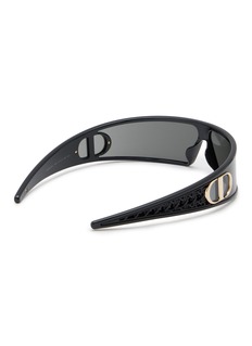 Christian Dior's futuristic shield sunglasses feature a striking wraparound single-lens design with the iconic logo hardware and intricate lattice-pattern temples. The bold architectural silhouette with panoramic coverage and signature embellishments delivers avant-garde couture style, while the streamlined construction and textured detailing create an unmistakable statement for fashion-forward sun protection.