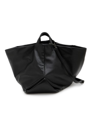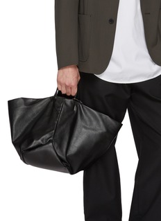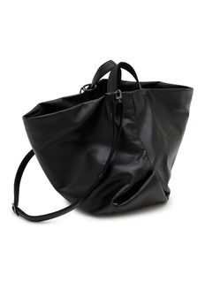 This DISCORD Yohji Yamamoto tote bag exudes a sleek, modern aesthetic with its luxurious black leather construction. The bag's spacious interior and unstructured design make it an ideal choice for those who value both style and functionality. Highlighted by minimalist details such as the subtle hardware and clean lines, it stands as a testament to sophisticated, contemporary design.
