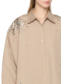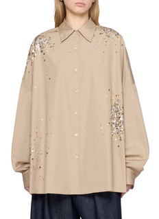 This Dries Van Noten shirt is a masterclass in understated glamour. Crafted from a smooth, light taupe fabric, it features a scattering of sequins and beads across the shoulders and down the sleeves, creating a subtle yet striking sparkle. The classic button-down design and pointed collar maintain a sophisticated profile, making it an ideal choice for both office settings and evening events.