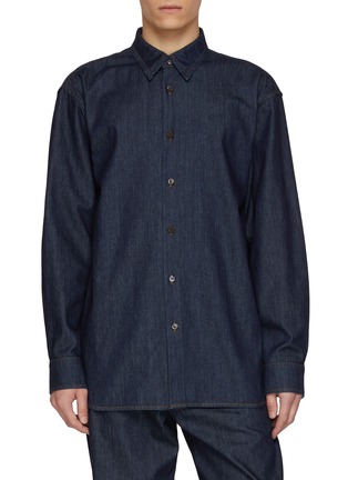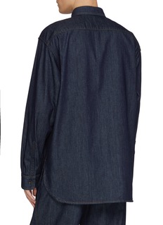 Dries Van Noten elevates the classic workwear shirt with an oversized, contemporary silhouette that balances structure with fluidity. The pointed collar and full-length button placket maintain timeless appeal, while the generous proportions and relaxed fit create modern, effortless style. A versatile wardrobe essential that pairs heritage detailing with refined Belgian craftsmanship.