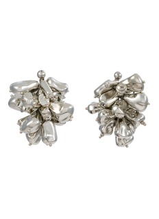 These Dries Van Noten earrings epitomize opulence with its lavish cluster of polished silver elements, creating a luxuriant, three-dimensional effect. Each piece is meticulously crafted to capture light from every angle, ensuring a dazzling display with every turn of the head. The combination of smooth and textured surfaces enhances the intricate design, adding depth and visual interest.