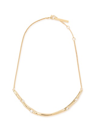 This elegant Dries Van Noten necklace is a masterpiece of understated luxury. Crafted in exquisite gold-tone metal, it features a sleek, curved bar centerpiece adorned with strategically placed crystals that catch the light with every movement. The slim chain enhances the necklace's delicate appeal, making it a versatile addition to both day and evening attire.