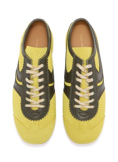 Balancing bold colour with refined craftsmanship, this slim sneaker from Dries Van Noten contrasts soft suede with smooth nappa leather overlays. The low-profile silhouette pairs seamlessly with cropped tailoring or relaxed separates, adding a considered yet playful edge to everyday dressing.