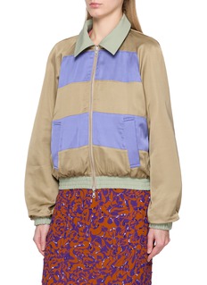 Effortless versatility redefined in this Dries Van Noten reversible jacket, where sage green meets lavender for a striking, two-in-one silhouette. The relaxed fit, elasticated cuffs, and functional zipper blend comfort with artistic flair, offering a bold, adaptable layer for modern wardrobes.